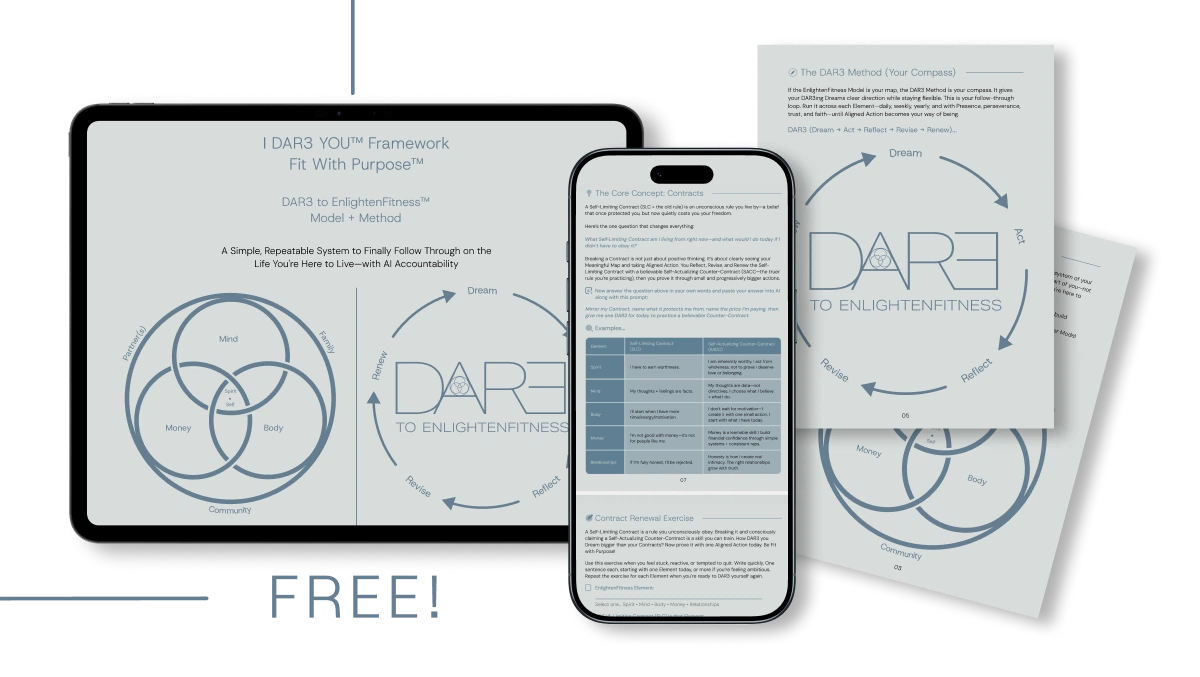 DAR3 was born in my breakdown-to-breakthrough season. I realized it wasn't a motivation problem—it was old limiting beliefs I was obeying. When I learned to name the Contract, see the Price, uncover the Payoff, and take one small Aligned Action anyway, my life began to change. That's the loop: Dream → Act → Reflect → Revise → Renew.